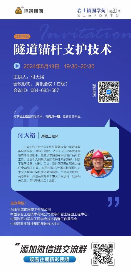 岩土锚固学苑将于2024年5月18日(周六)19:30-20:30举办第20期,本期主题:隧道锚杆支护技术,欢迎广大岩土锚固领域爱好者参与交流。