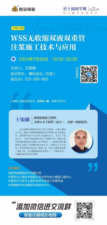 岩土锚固学苑将于2024年7月20日(周六)19:30-20:30举办第21期,本期主题:WSS无收缩双液双重管注浆施工技术与应用,欢迎广大岩土锚固领域爱好者参与交流。