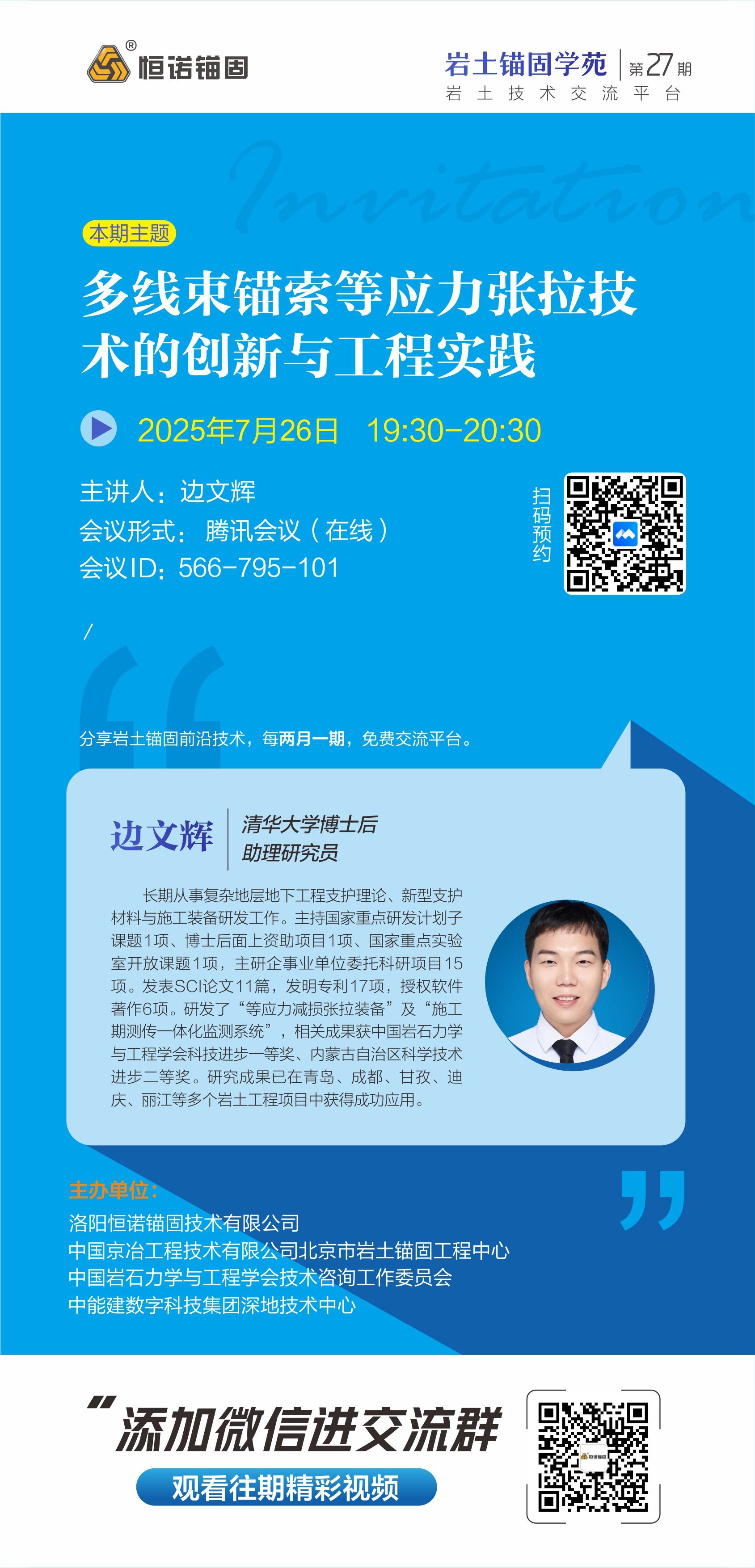 岩土锚固学苑将于2025年7月26日(周六)19:30-20:30举办第27期,本期主题:多线束锚索等应力张拉技术的创新与工程实践,欢迎广大岩土锚固领域爱好者参与交流。