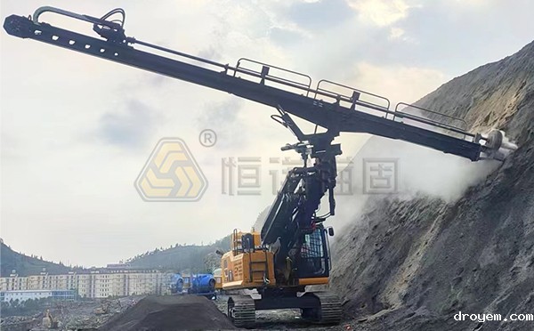 高举钻机举升高度在9-40米,采用整体集成结构,由行走系统、动力系统、液压操控系统、举升系统和钻进系统五大部分组成。高举钻机可以搭配不同动力头,用以匹配不同施工工艺的钻进施工,如潜孔钻进、跟管钻进、螺旋钻进、顶锤方式钻进等。高举钻机主要适用于铁路、公路、水电站等大型高边坡支护、危岩体加固工程,或大型隧道工程施工使用。
