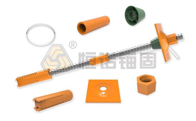 先锚式中空锚杆(机械锚固)由中空锚杆体、螺母、垫板、连接套(选用)、涨壳锚头组成,型号包含R25、R32、R38三种。
